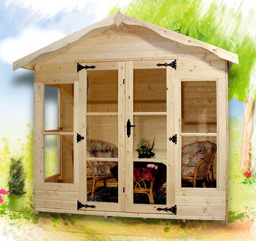 The Rosedale - An Apex roof summerhouse featuring large pane doors and windows. The Rosedale is supplied as standard with joinery made double doors with a fitted mortice lock, decorative hinges and handle, a 300mm roof canopy complete with shaped fascia boards.  Manufactured from 15mm tongue and grooved shiplap on 45 x 34mm planed framework.  Window size and quantity varies depending on the size of the building.  A 600mm verandah and opening side window are available as an optional extra.  Internal eaves height is 1.8m.